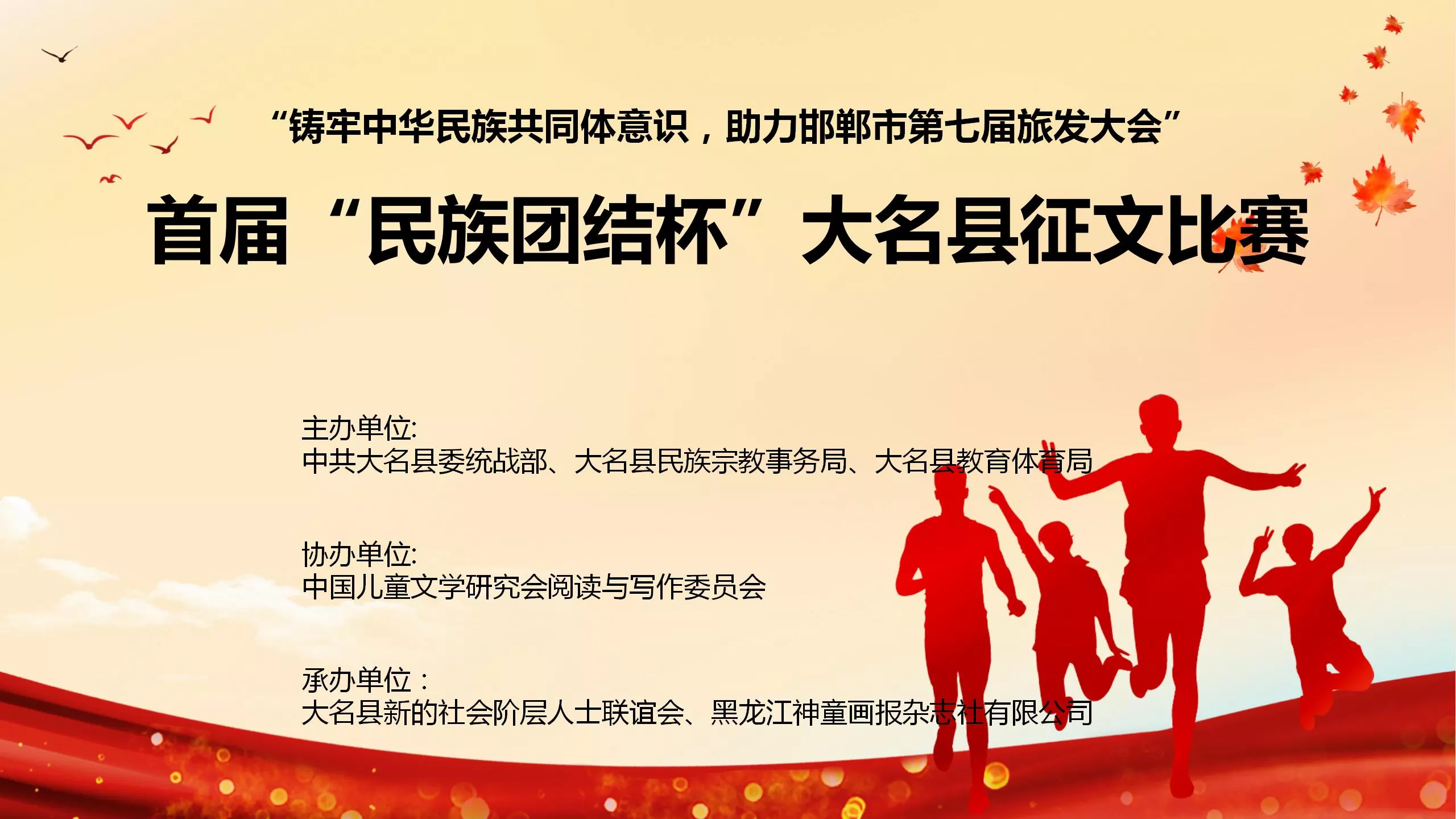 “铸牢中华民族共同体意识,助力邯郸市第七届旅发大会” 首届“民族团结杯”大名县中小学征文活动 一、设立宗旨培养各族青少年爱国、爱党、爱社会、爱大名的良好品格。二、征文主题邯郸市第七届旅发大会在即,请以此为契机,发挥小主人翁作用,邀请全国各地的各族青少年朋友来大名游玩,并从人文历史、特色美食、民族团结、农业文明、旅游景点等方面介绍大名。三、组织机构(一)主办单位中共大名县委统战部大名县民族宗教...